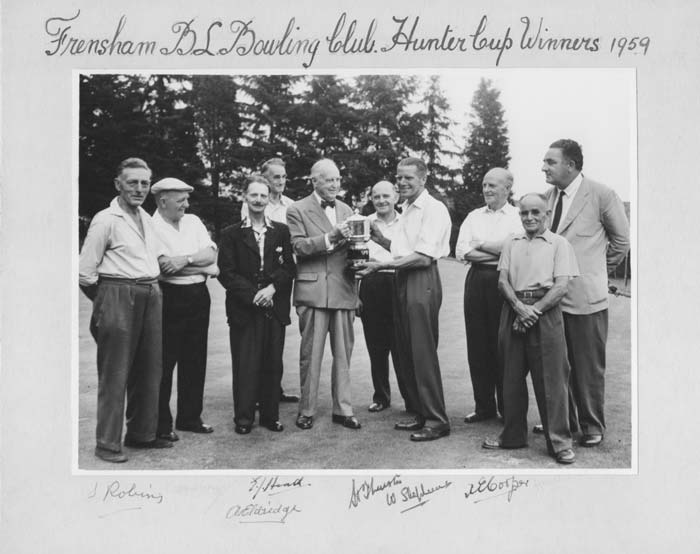 Fixtures were confirmed against Elstead and Hindhead and by May 17th the membership stood at 26 with Maj. Gen. Sir Alfred Blenkinsop being elected President.The Club went from strength to strength both on the green and financially with Wally Dadson being Secretary for 13 consecutive years and Harold Morby , Treasurer for 26 years unbroken! Mr Edward Hunter became President in 1936 on Sir Alfred’s death and continued in that role for 20 years. He presented the Club with the Hunter Cup in 1939 to be competed for annually by village clubs that Frensham played against. This competition has been running for 75 years (2014) and the first winners, Liphook won it again for the second time in its anniversary year! Frensham have had successes in it over the years in 1940, 1948, 1959, 1964, 1981, 1984, 1992/93 and 1997.